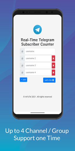 Real-Time subscriber counter for Telegram which supports multiple groups and channels. Features: -> Real time live counter -> Currently 4 username support -> Cross platform support