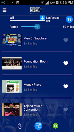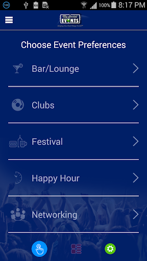 My Social Events lets you customize your profile for the preference (Clubs, Parties, Festivals, Events, Happy Hours, Concerts, etc.) and genre (Jazz, Urban, age 24-35, age 18-21, Rock, Live Music, Cigar, etc.) of the type of functions you like to attend. Once your settings are saved you will see a listing of your preferences within 50 miles of your present location at the press of a button.