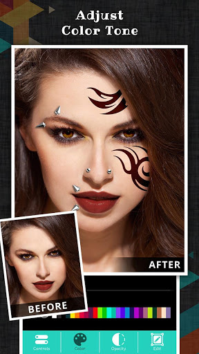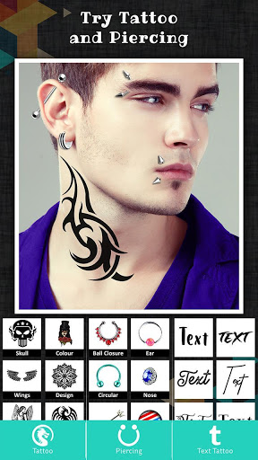 Tattoo My Photo have multiple awesome tattoo designs: 500 attractive tattoo stickers, 250 piercing stickers and 25 tattoo fonts, so that you can make your inked photo without pain or skin infection.