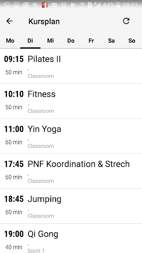 Direkter und aktueller Zugriff auf den Kursplan von überall: Für jeden Kurs kannst Du Details wie Zeit, Kursbeschreibung, Raum und Merkmale wie z.B. den Schwierigkeitsgrad einsehen.