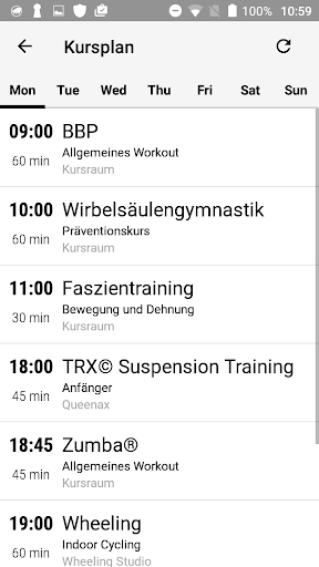 Direkter und aktueller Zugriff auf den Kursplan Ihres X-Force Sport Club von überall: Für jeden Kurs können Sie Details wie Zeit, Kursbeschreibung, Raum und Merkmale einsehen.