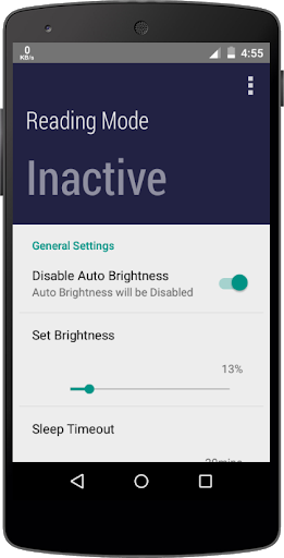 • Increases the sleep timeout of the screen to a longer interval so that it does not go away while you are still busy reading.