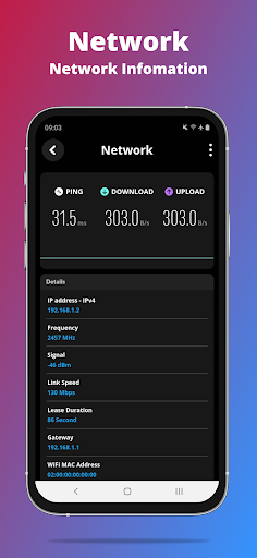 - Network: IP Address, Gateway, Subnet Mask, DNS, Lease Duration, Interface, Frequency & Link Speed