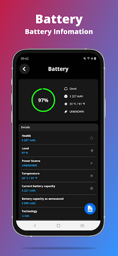 - Battery: Health, Level, Status, Power Source, Technology, Temperature, Voltage & Capacity