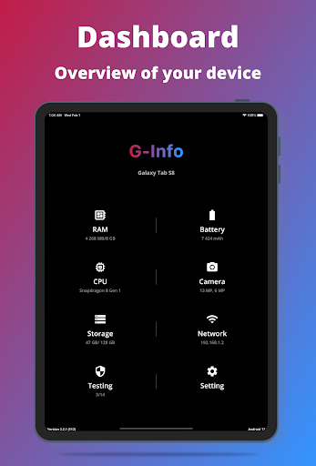 - Dashboard: RAM, Internal Storage, External Storage, Battery, CPU, Sensors Available, Tests, Network, and Settings App