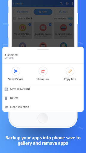 - Use Bluetooth file transfer to easily save apps to phone and transfer files from one phone to another phone. Bluetooth file sender also enables you to send apk, share apps with your friends via Bluetooth.