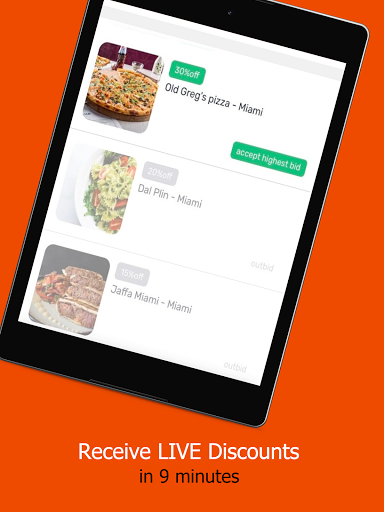 Each restaurant will outbid one another to give you their maximum offered % off discount that will be applied to your total bill. A minimum of 20% off will start the bidding process- cha ching!