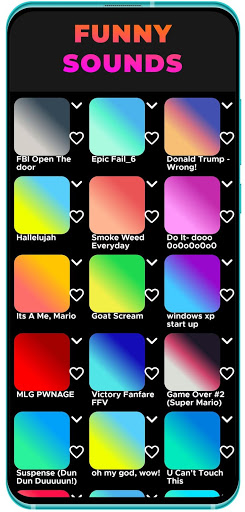 Our collection is based on the last trends on internet, you can 15 categories, among which you can find memes, anime, MLG, gaming, Troll, Funny, Horror, Distorted, Prank, Ambient sounds, Notifications or ringtones and much more.