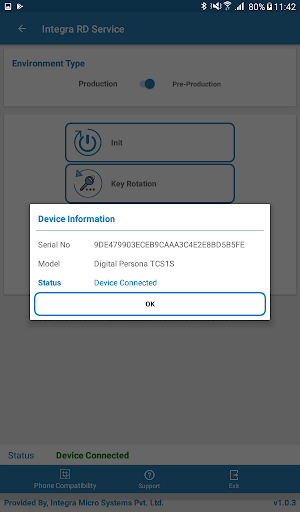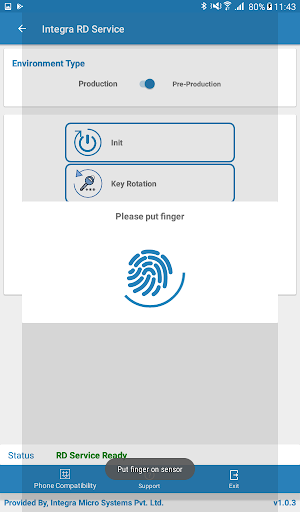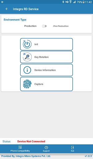 This application is the Registered Device Service (L0) for Fingerprint Scanners UareU 4500, TCS1S and SQUIRREL (Bluetooth) provided by Integra Micro Systems Pvt Ltd. This application captures Fingerprint as per UIDAI guidelines for Aadhar Authentication and eKYC. L0 RD Services for the above devices enable your solutions and end users to validate their Fingerprint Scanners with UIDAI with the help of our Management Server. For registering the Fingerprint scanner with UIDAI, you would require at least one unit of any of the above devices. Device details should be mapped in the management server for device registration.