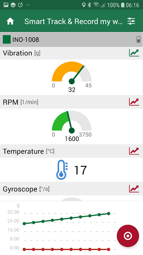 Ino operation control is the combination of application and sensor, which is mounted on any machine. The sensor records machine 's working properties: RPM, vibrations, angular speed, GPS coordinates, working hours and working temperature. This data is recorded on the sensor's onboard memory storage. The recorded data can be accessed via the application. It allows also real time parameter access via the application.