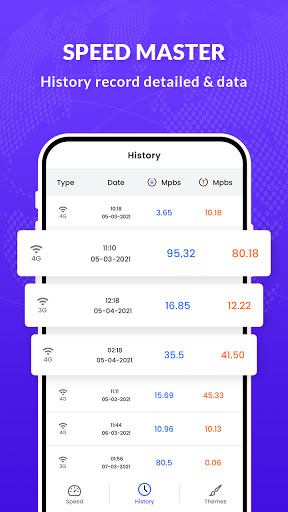 Keep track of network connection over the time. History tab stores information of each network and phone speed test. Use this function of internet connection checker as a wifi signal analyzer for choosing the best local WiFi spot or checking internet service provider. Try to test internet speed from different sources and filter the results.