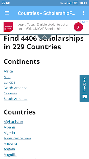 This app updates you, allows you to search, find and get information regarding latest scholarship opportunities available worldwide for international students for their undergraduate, masters, post-graduate, graduate, PhD degrees in world's renowned universities for free.