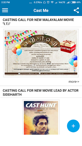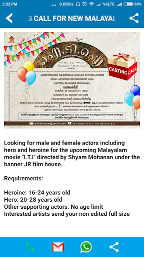 Cast Me application will help the peoples, those who are looking for a job in Film Industry. Cast Me app provides casting calls and audition notices for the job seekers with an user friendly interface. Also the candidates can directly send their Portfolio or Resumes into WhatsApp or E-mail with in this Application. Cast Me team is will collect and update the casting calls and list them in Cast Me app. More over users who wish to advertise their casting calls, can directly publish using Cast Me app. Our admin panel will approve those after their validations. Cast Me app service is completely free of cost.