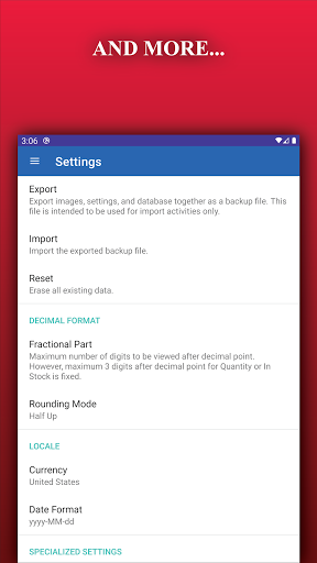 * Import and export app data (settings, database, images).