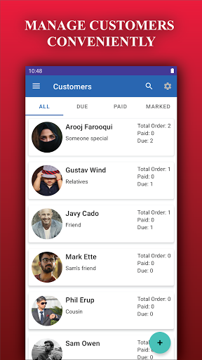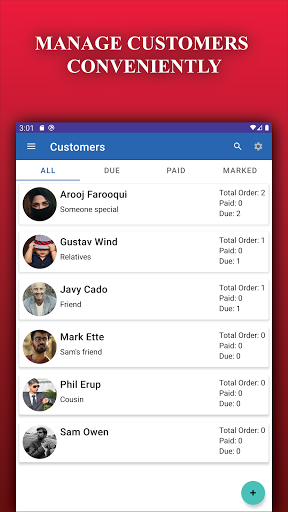 You can create customers by providing details or import customers from the contact list. Customer is displayed according to their payment status (All, Paid or Due) and bookmarked customer in the marked screen. The number of totals, due, and paid orders are displayed in the listing. All of the orders associated with the specific customer can be viewed and customized from the customer screen. The visibility of specific items on the list can be changed from customer settings.