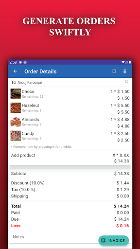 You can manage orders with less effort by providing only your required information. Tax and discount can be used in multiple variations. The product can be imported in the order from stock by navigating through the stock list or using a barcode scanner. However, you cannot add the quantity of a specific product greater than the available quantity in stock. On the other hand, a new product can be created only for this order without thinking of stock.