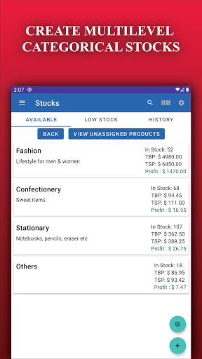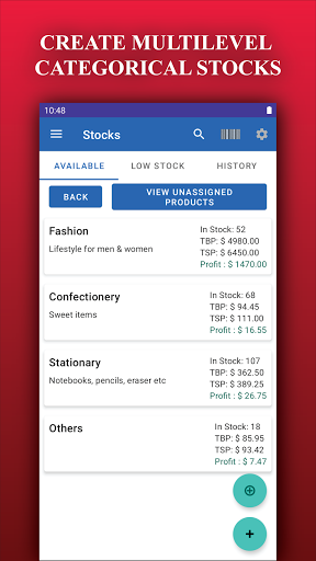 You can manage stocks in isolation or combined with order management. Product listing is customizable from stock settings where you can choose which item (images, description, buying price, selling price, etc.) should be visible in the list item. If the multilevel category is enabled from settings, then the categorical listing will be visible. You can set the low stock limit and reminder for items that reach the limit according to your preference from stock settings. Furthermore, you can create and search an item using the barcode scanner. Finally, product transactions can be done from a different screen to add or subtract a specific quantity (whole number or fractional).