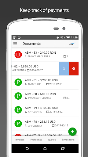 - Create Invoices, Pro-forma documents, Quotes and Timesheets.