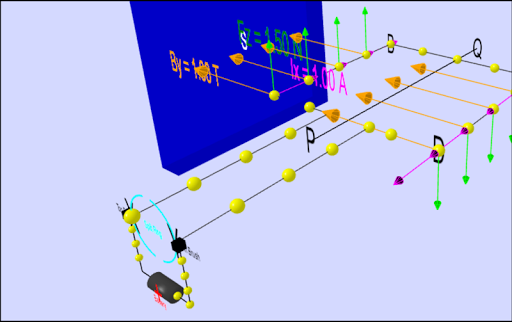 The key to producing motion is positioning the electromagnet within the magnetic field of the permanent magnet (its field runs from its north to south poles). The armature experiences a force described by the left hand rule. This interplay of magnetic fields and moving charged particles (the electrons in the current) results in the magnetic force (depicted by the green arrows) that makes the armature spin because of the torque. Use the slider current I to see what happens when the flow of current is reversed. The checkbox current flow & electron flow alows different visualization since I = d(Q)/dt and Q= number of charge*e. The Play & Pause button allows freezing the 3D view for visualizing these forces, for checking for consistency with the left hand rule .