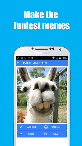 Meme Generator Free is an app where you can create the most fun memes and share them with your friends. The app comprises best compilation of picture meme available on the web. Import images from your gallery or camera. Insert text at the top and bottom of the images or wherever you want, you can also change the style and size of the text to create the best memes. Turn the photos of your friends, family or whatever you want into funny memes with the help of our app. ¡Laugh out loud with your friends!