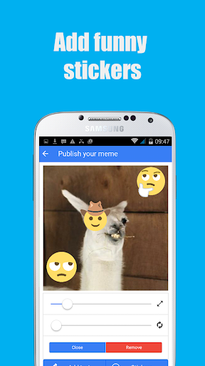 Meme Generator Free is an app where you can create the most fun memes and share them with your friends. The app comprises best compilation of picture meme available on the web. Import images from your gallery or camera. Insert text at the top and bottom of the images or wherever you want, you can also change the style and size of the text to create the best memes. Turn the photos of your friends, family or whatever you want into funny memes with the help of our app. ¡Laugh out loud with your friends!
