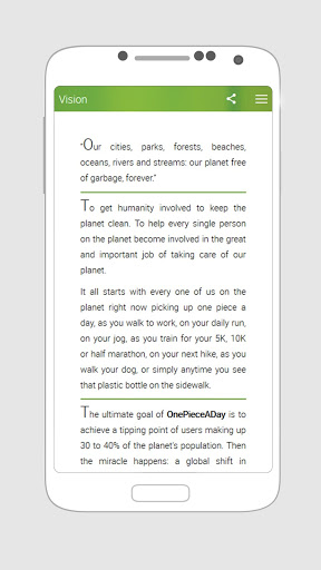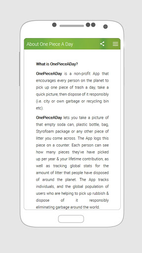 One Piece A Day is a non-profit App that encourages every person on the planet to pick up one piece of trash a day, take a quick picture, then dispose of it responsibly (i.e. city or own garbage or recycling bin etc).