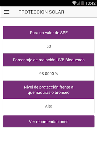 Ingresando el valor de SPF impreso en la etiqueta frontal del producto, este programa calcula el valor de proteccion contra las quemaduras y bronceo ( radiacion UVB).