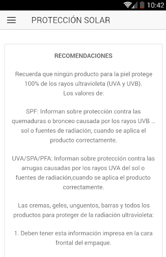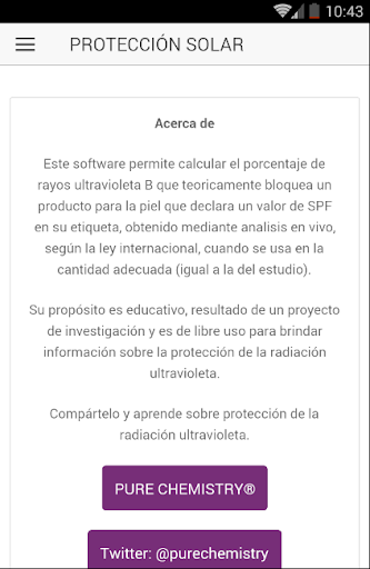 SPF PURE CHEMISTRY es una aplicación que te permite conocer el nivel de protección solar que ofrecen los bloqueadores solares del mercado y te da varias recomendaciones para que cuides tu piel.