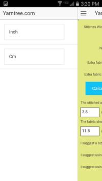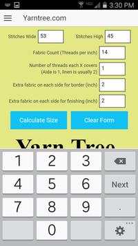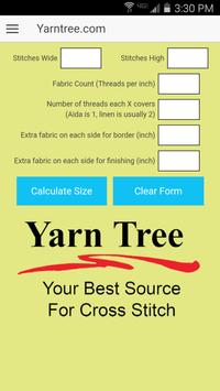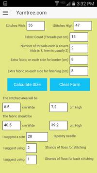 Free with no ads. The Yarn Tree Cross Stitch Calculator app calculates the stitched design size and the size of fabric needed. It even suggests the size of tapestry needle to use, and the number of strands of floss to use for cross stitching and back stitching. Can be set to either inches or cm. From Yarn Tree, your best source for counted cross stitch.