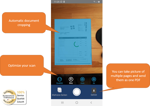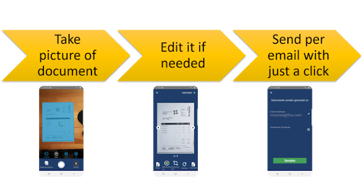 The IPA Mobile Scan App enables you to take photos of documents and send them to any email address as a PDF file. The following functions make this app so successful: