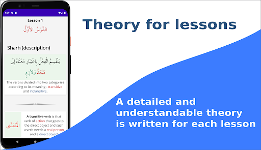 Tab "Description of lessons (sharh of the Medinah course)". Full and detailed description of the Arabic language rules used in this lesson