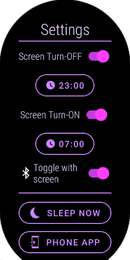 This small app intended to solve all these problems by allowing you to set the time when screen will be automatically turned off (when you go to bed) and turned back on again (before your alarm).