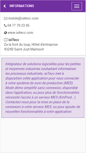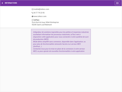 Intégrateur de solutions logicielles pour les petites et moyennes industries souhaitant informatiser les processus industriels, isiTecc met à disposition cette application pour vous connecter à votre système de suivi de production (MES).