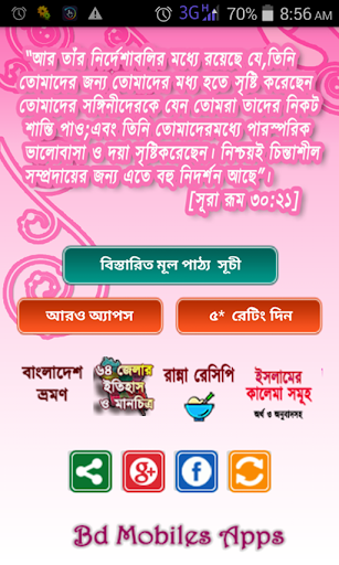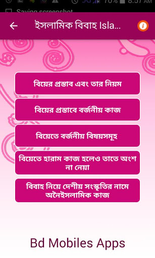 L'app islamica di matrimonio islamica è stata presentata come un documento del verso del Qur'an Sharif (Corano) Bengali. E da Bukhari Sharif e Muslim Sharif è stato dato come hadiths (hadis) e documenti. L'app è stata tenuta in mente il linguaggio linguistico completamente bengalese, quindi come rendere le regole del matrimonio e il matrimonio in Bangla e il matrimonio come preparazione del matrimonio in Bangla e educazione araba, come il matrimonio e il matrimonio prima del matrimonio -