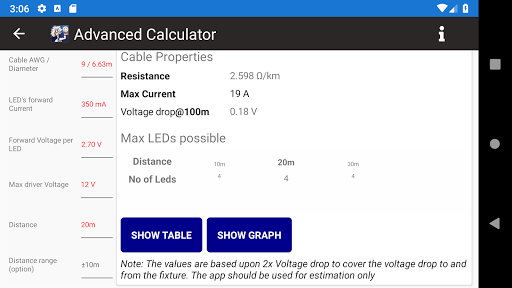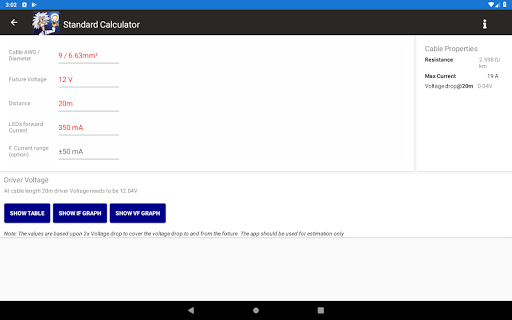 Simple tool to calculate voltage drop on cables between LED drivers and LED fixtures. Masterful piece of software that has simple calculation tool or more advanced options for those who know what they are doing.