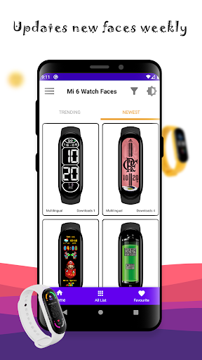 1) Home layout of the app has 3 tabs: NEW, TREND, FAVOURITE displays the NEW images mi band 6; TREND displays the images mi band6 which many people views; FAVOURITE displays the images mi band 6 watchfaces which you like.