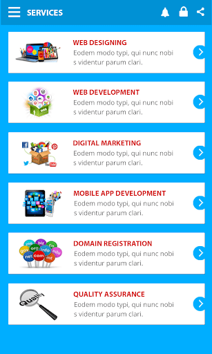 The Information Technology Company application is designed with various categories inbuilt for IT Services provided by an IT Company such as Web designing & development, Mobile Application development including Android App & IOS App Development, SEO, Digital Marketing, CRM & other enterprises ERP & Customized Software etc. It contains specific information related to the variety of services in each category so that one can easily get information about the services that someone wants to avail.This Business App also comprises the contact details and location of the company so anyone can easily locate the IT Company and the detailed "about us" category would educate the users about the company. It also highlights the completed & the running projects through the portfolio section, this makes the mobile application easily accessible & understandable to the user. The efforts & expertise of our Mobile app developers we have ensured that the application is easy to use & can increase the convenience of the users. This Mobile app is user-oriented and has a friendly user interface.Users can contact easily for a better feedback.Contact Information and feedback mechanism.