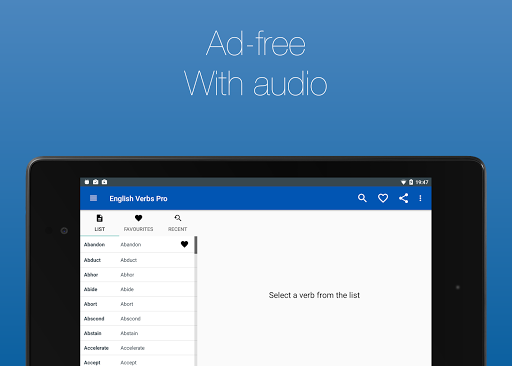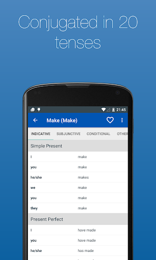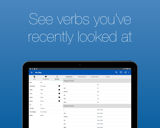 Now with audio!! Not sure how to pronounce a verb? You can now hear how every verb is pronounced. Just tap on the button next to the conjugation. Verbs with audio have a speaker symbol next to them. Note: this functionality requires an Internet connection.
