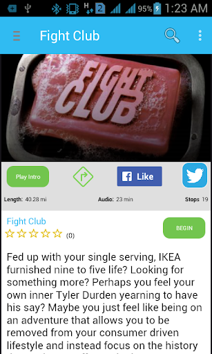 Fed up with your single serving, IKEA furnished nine to five life? Looking for something more? Perhaps you feel your own inner Tyler Durden yearning to have his say? Maybe you just feel like being on an adventure that allows you to be removed from your consumer driven lifestyle and instead focus on the history that LA has to offer. From the Condo that starts it all to the House on Paper Street to Project Mayhem locations, experience Los Angeles, Fight Club Style. This tour features 23 minutes of narrated audio.