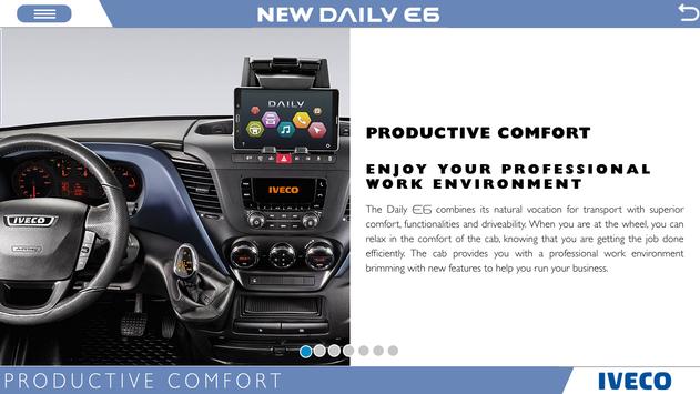 New Daily E6 is the original IVECO application for your smartphone and tablet. IVECO lets you discover everything you need to know about the New Daily Euro 6 in one interactive app.