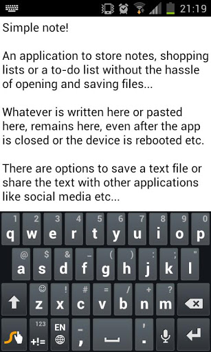 Export the on-screen text to a standard text file (mnt/sdcard/SimpleNote.txt)