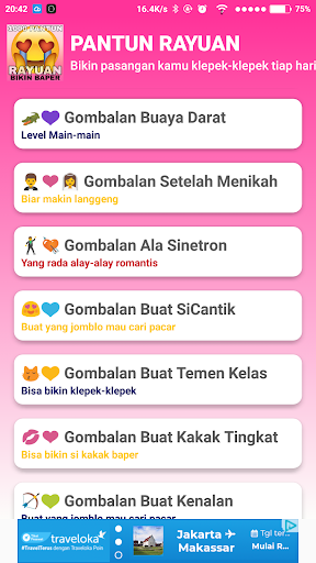 1000 Pantun Rayuan Bikin Baper adalah sebuah aplikasi ringan yang berisi ribuan Pantun Rayuan jaman now,Pantun rayuan Buaya darat, Pantun Rayuan humor, Pantun Rayuan pendek, Pantun Rayuan komedi, Pantun Rayuan ngakak, Pantun Rayuan joke,Pantun Rayuan pelesetan, Pantun Rayuan lucu bahasa Indonesia.