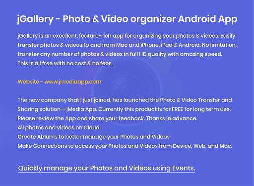 jGallery app provides easy sharing & transferring your photos-videos with iPhone, iPad & Mac devices. No limitation, transfer any number of photos videos in full HD quality with amazing speed. Get premium access for free of cost.