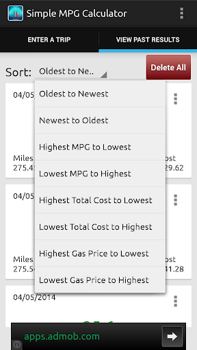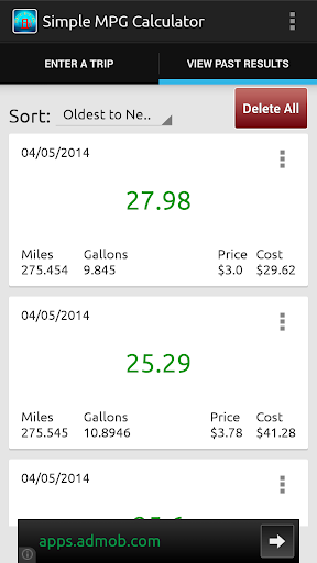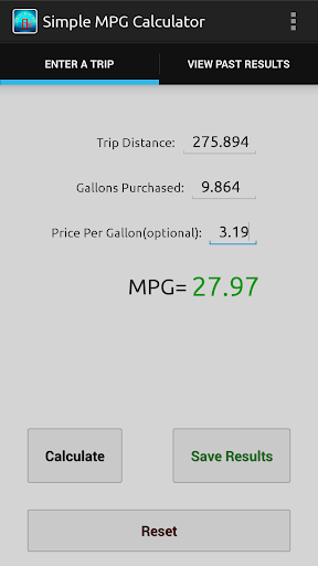 Calculate and save your MPG on every fill up! You can look through your history to see your MPG trends. Individual trips can be deleted, or all of them to start fresh.