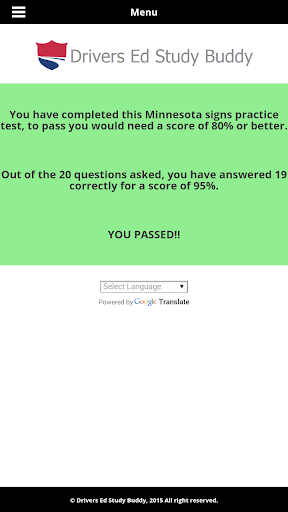 Drivers Ed Study Buddy's Minnesota driver license test, provides unlimited free driver license practice test from a pool of over 1500 test questions. Our Minnesota driver license test provides you with realistic test scores so you'll know when you're ready to take your written test. All of our Minnesota driver license test are randomly generated (just like at the DMV) each time you begin a test insuring you know the information needed to pass your test and not just memorized some questions. This helps you become more familiar with the test and helps you figure out where you may need to study more.