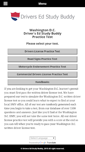 Drivers Ed Study Buddy's Washington DC driver license test, provides unlimited free driver license practice test from a pool of over 1500 test questions. Our Washington DC driver license test provides you with realistic test scores so you'll know when you're ready to take your written test. All of our Washington DC driver license test are randomly generated (just like at the DMV) each time you begin a test insuring you know the information needed to pass your test and not just memorized some questions. This helps you become more familiar with the test and helps you figure out where you may need to study more.