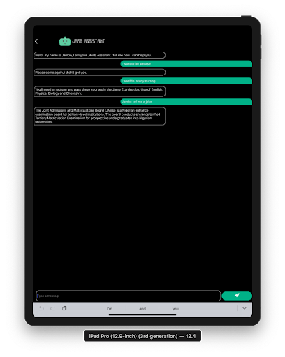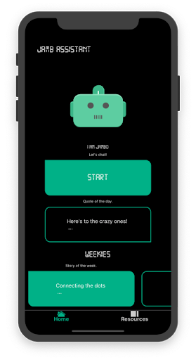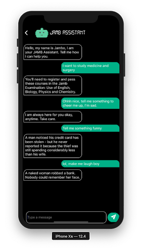 JAMB Assistant is a special guide bot for JAMB, the Joint Admissions and Matriculation Board. This application is build to help you or yours, achieve their dreams, for we can only make choices we know exist.
