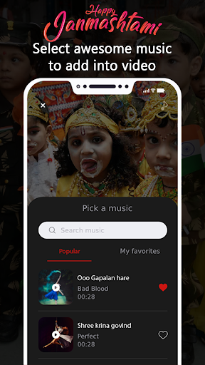 Janmashtami Video Maker With Music is the easiest way to create, edit and share amazing music videos, slideshow and stories with your photos, videos and free music with latest added features and Load Krishna Frame. Let’s make every moment of your day into a work of art with video maker editor special effect apps.