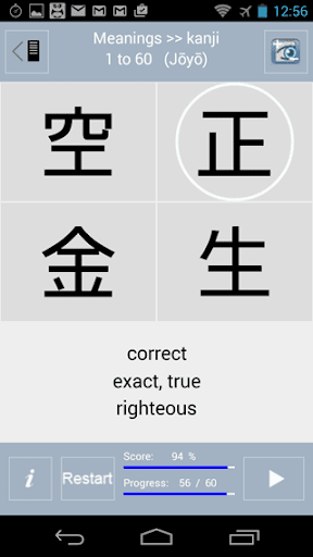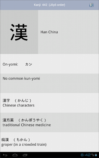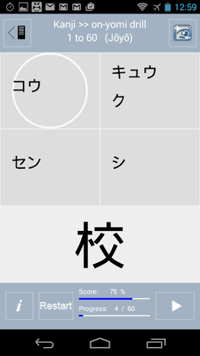 * Ten multiple choice drills on meanings, On-yomi (Chinese readings) and Kun-yomi (Japanese readings), radicals and elements.