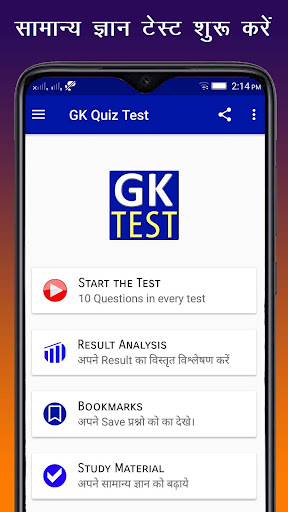 सामान्य ज्ञान क्विज टेस्ट एप में आपका स्वागत है। इस एप में हमनें भारत में आयोजित होने वाली विभिन्न प्रकार की प्रतियोगिता परीक्षाओं में सामान्य ज्ञान से संबंधित पूछे जाने वाले बहुविकल्पी (MCQ) प्रश्नों को सम्मिलित करने की कोशिश की गई है। इस में लिए गये अधिकांश प्रश्न अक्सर प्रतियोगिता परीक्षाओं में पूछे जाते है। इस एप द्वारा आप प्रतियोगी परीक्षाओं की तैयारी की जांच भी कर सकते है। आपको किस श्रेणी में अधिक सुधार करना है एवं किस श्रेणी में आप अधिक निपुण है के लिए परिणाम का विश्लेषण कर सकते है।